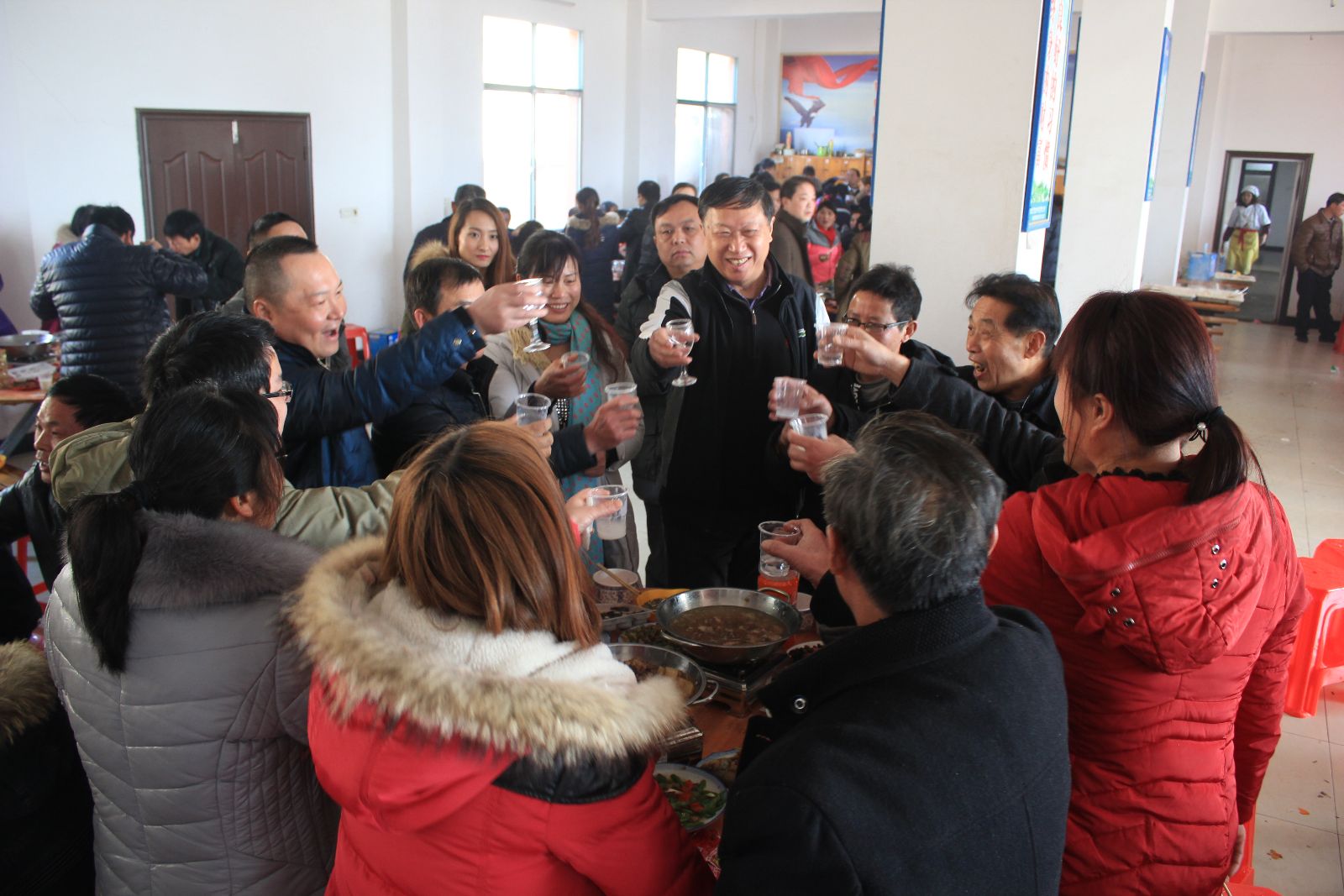 年会结束后,全体员工进入公司食堂享用了丰盛的年饭,席间董事长携各部门领导一同敬酒,预祝大家新年快乐。全体员工也一齐高举酒杯,祝福美天的未来越来越好。