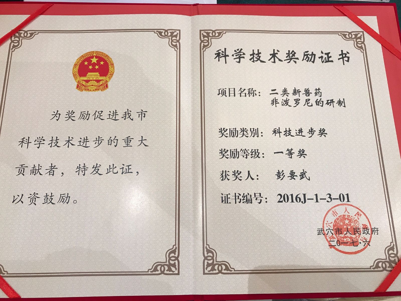 星空(中国)官方体育网站-登录入口 荣获“武穴市十佳科技创新企业”的荣誉称号,公司董事长兼总经理彭要武先生被评为“十佳创新人才”,企业申报的二类新兽药非泼罗尼的研制项目被评为“科技进步一等奖”。参会领导及各组成员对获奖企业和个人表示了热烈的祝贺和高度的赞扬。