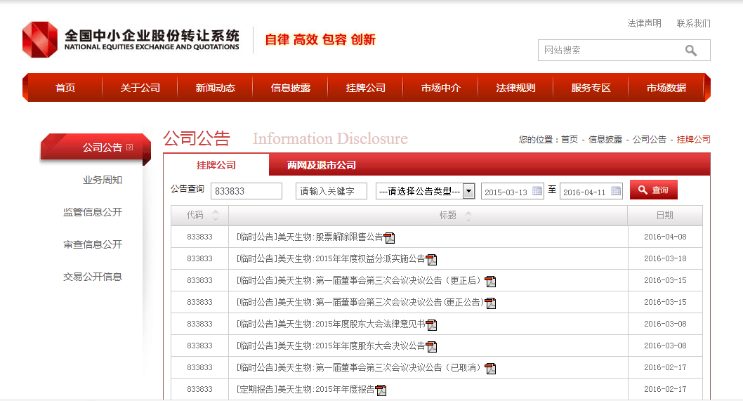 2016年4月8日,全国中小企业股份转让系统发布公告《美天生物股票解除限售公告》。星空(中国)官方体育网站-登录入口 证券代码为833833,证券简称美天生物,主办券商为申万宏源。本批次股票解除限购数量总额为29682395股,占公司总股份的比例为58.29%,可转让时间为2016年4月15日。具体信息详见公司在股转系统发布2016-007号公告。