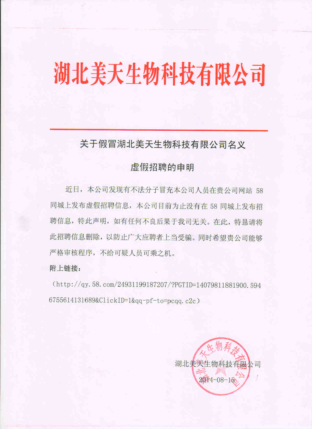 关于本公司招聘的声明 今日,本公司发现有人假冒本公司的名义在赶集网、58同城等网站上发布虚假招聘信息。本公司在此声明,本公司现今仅在前程无忧(51job)上发布招聘信息,其他均为可...